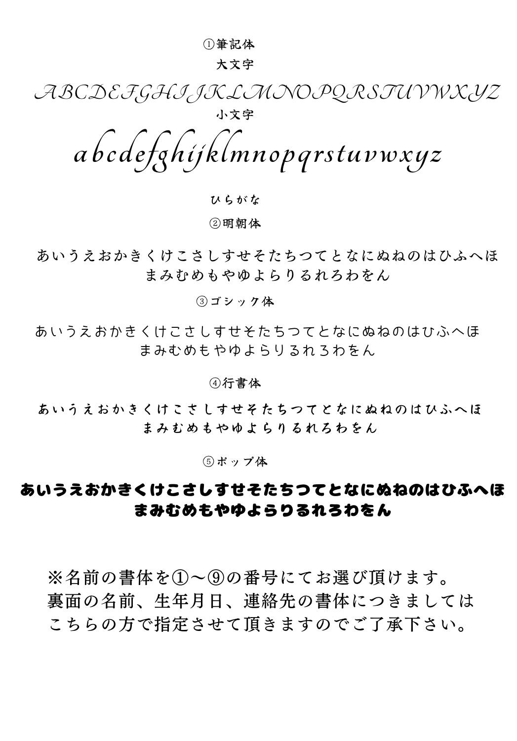 写真の書体の番号とわんちゃん猫ちゃんの名前を